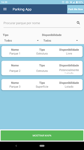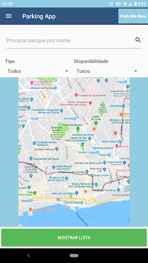 O utilizador pode pesquisar por parque de estacionamento pesquisando num ecrã de lista ou num mapa.
