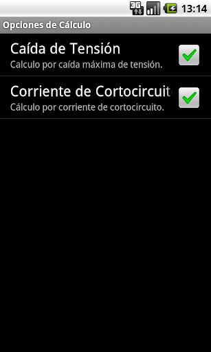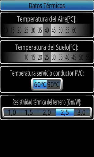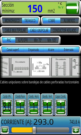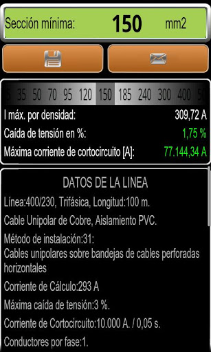 Nos resultados permite a mudança da secção calculada, de modo que mostra a corrente máxima de linha, a queda de tensão e de curto-circuito de corrente máxima.