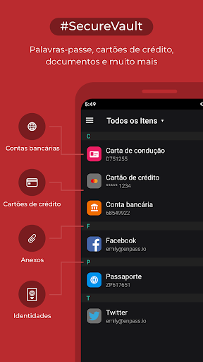 Use o Enpass para organizar tudo em segurança em um só lugar. E o melhor, nenhum dos seus dados do Enpass fica armazenado nos nossos servidores. Em vez disso, ficam armazenados localmente no seu dispositivo e você pode sincronizar através da sua própria conta da nuvem de confiança, tudo ENCRIPTADO!!