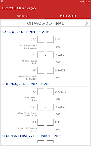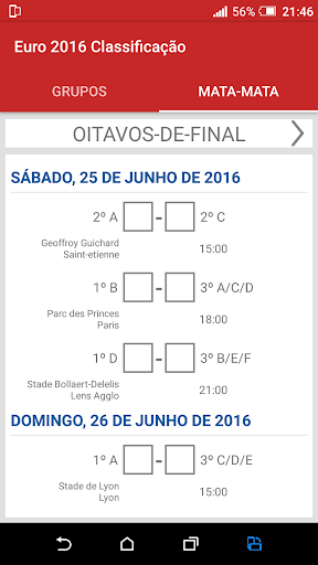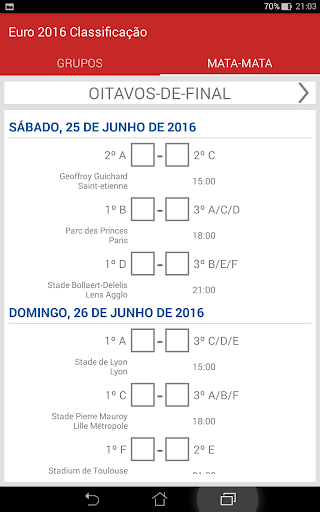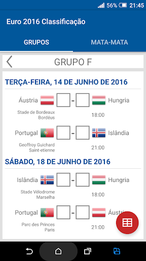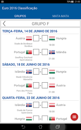 Você só precisa introduzir os resultados, e o App cria todas as tabelas e calculado o que a equipe chegar nos Playoffs. Também o aplicativo tem um calendário de jogos. Você pode acompanhar os jogos e preencher a sua própria tabela de Euro 2016.