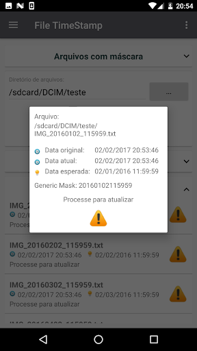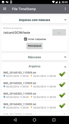 Exibição de lista de arquivos antes do processamento, com informações de timestamp atual e obtido através de máscara ou EXIF.