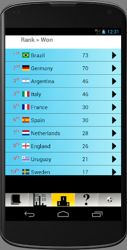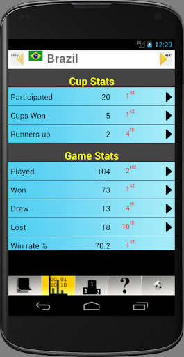 App que pode fazer de você um campeonato mundial de futebol Stats Guru ou apenas ter informações e estatísticas interessantes em suas pontas de dedos. Traz dados de todos os formatos de torneio e anos de 1930-2018 e oferece informações, estatísticas e ranking para todos. Os dados são disponibilizados por país, por ano ou por fase do torneio.