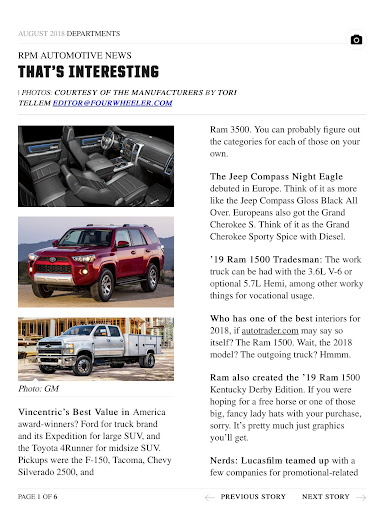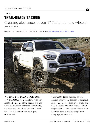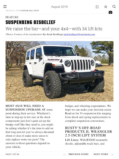 O Four Wheeler é a revista principal de entusiastas e profissionais de tração nas quatro rodas.Cada edição apresenta novas avaliações de testes de veículo, instruções técnicas práticas, novos produtos, dicas de direção e um calendário de eventos de corrida off-road. "