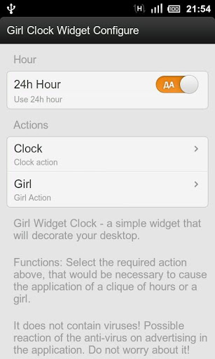 GirlWidgetClock widget with clock and battery that will decorate your desktop.Girl Widget Clock a simple widget with clock and battery that will decorate your desktop. It does not contain viruses Possible reaction of the antivirus on advertising in the application. Do not worry about itPlease post messages about the virus and the presence of advertising in the application