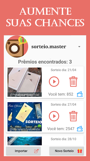 permite que você encontre os usuários que estão promovendo sorteios no instagram e dá um "boost" nas suas chances de ser o vencedor.