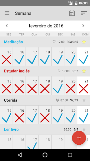 Visualização do calendário de progresso semanal. Registre todos os hábitos/metas em uma tela.