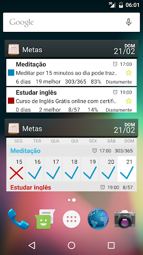Widgets (apenas Android 4.0 e posterior). Seus hábitos/metas estão ao seu alcance.