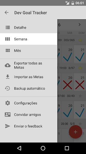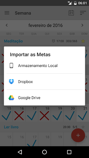 Backup automático diário para armazenamento local. Use o calendário para selecionar qualquer dia da semana passada e restaurar os hábitos/metas, se necessário.