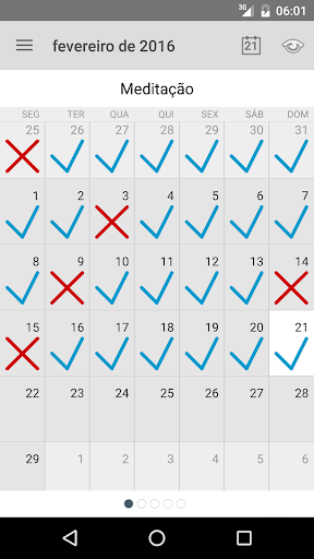 Visualização do calendário mensal. Registre todos os dias em uma tela.