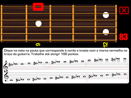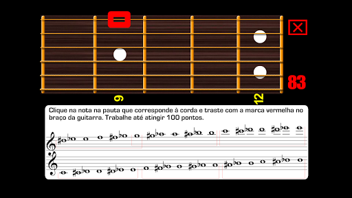 Quando o exercício começa clique nas cordas e trastes da guitarra correspondentes às notas que são ouvidas e que você deve ler em tempo real. Você ganha pontos por cada clique correto.