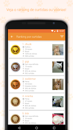 Também, há um ranking com os melhores gatos do hashcat, por vitórias ou curtidas, por categoria, raça, país e idade!