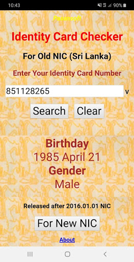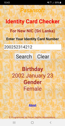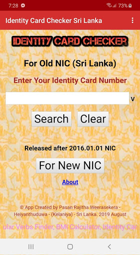 පුද්ගලයෙකුගේ ජාතික හැදුනුම්පත් අංකය ඇතුල් කර උපන් දිනය හා ලිංග භේදය ලබා ගත හැකි App එකකි. මෙයින් පරණ හැදුනුම්පත මෙන්ම 2016 ජනවාරි මාසෙන් පසු නිකුත් කරන නව හැදුනුම්පත් අංක පරීක්ෂා කල හැකිය.