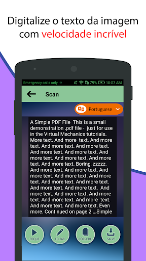 Quer pegar o texto do PDF? O grabber de texto é o recurso ace de "Conversor de imagem para texto, PDF OCR, Digitalizar e traduzir", que facilita a criação de texto a partir de PDF, imagem e qualquer arquivo gráfico e em seguida você pode ouvir esse texto como um audiolivro. O grabber de texto funciona para todos os arquivos gráficos, imagens, arquivos de texto e arquivos pdf. Você pode usar este aplicativo como capturador de texto PDf e OCR PDF, embora "Conversor de imagem em texto, OCR em PDF, Digitalizar e traduzir" não precise passar seu arquivo PDF por meio do OCR, mas apanha texto diretamente do PDf.