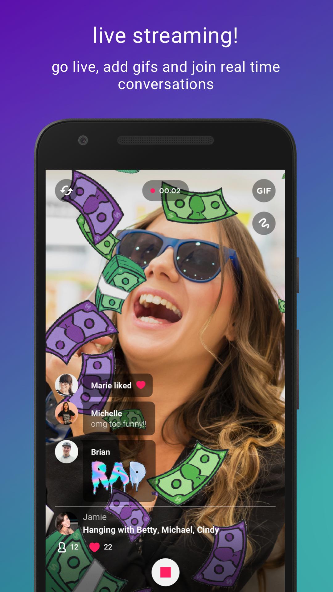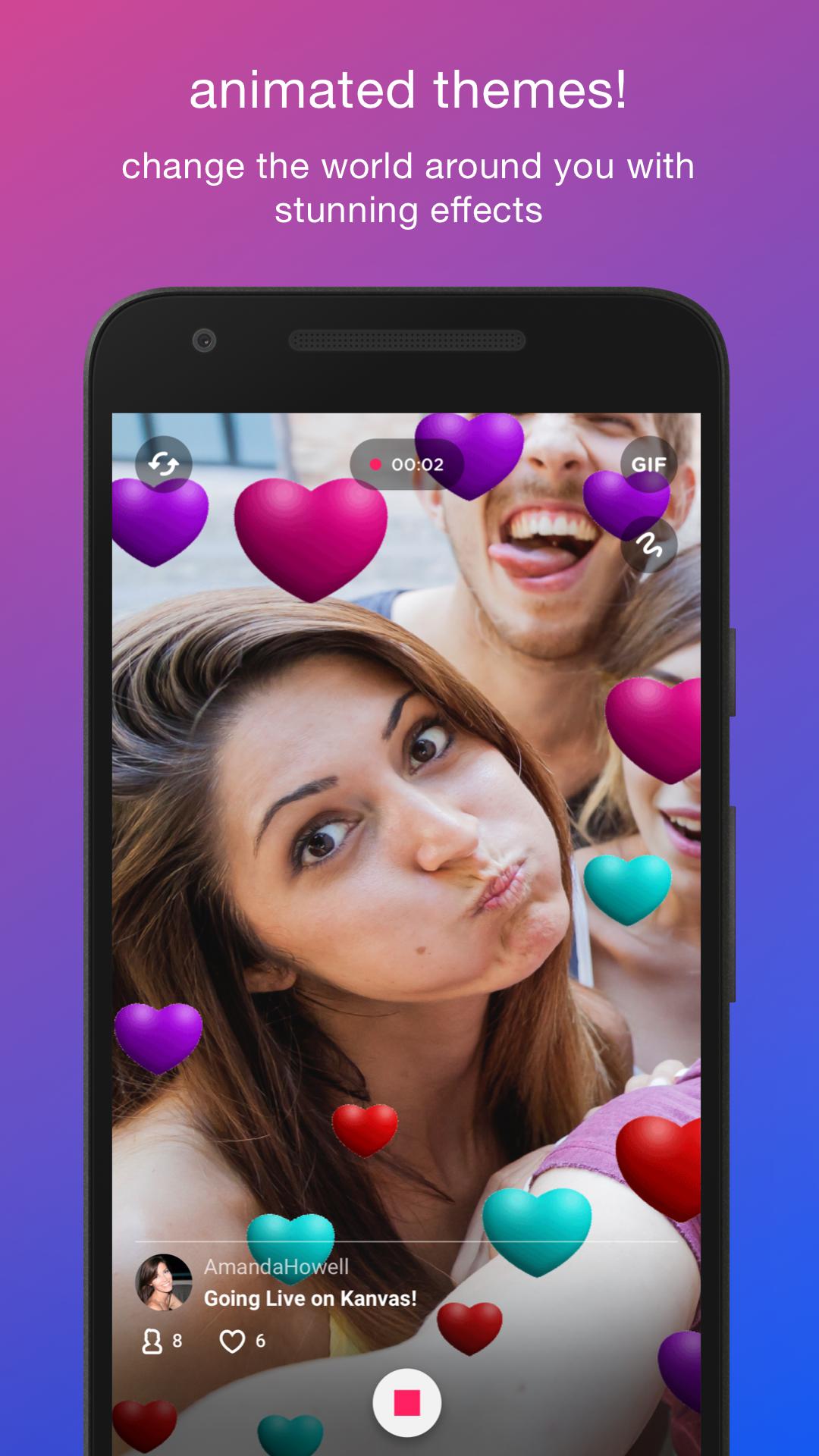 Kanvas gives you the craziest live streaming experience ever! Instantly change the world around you with stunning visual effects, filters, animated gif stickers and drawing tools. Viewers can live with broadcasters,