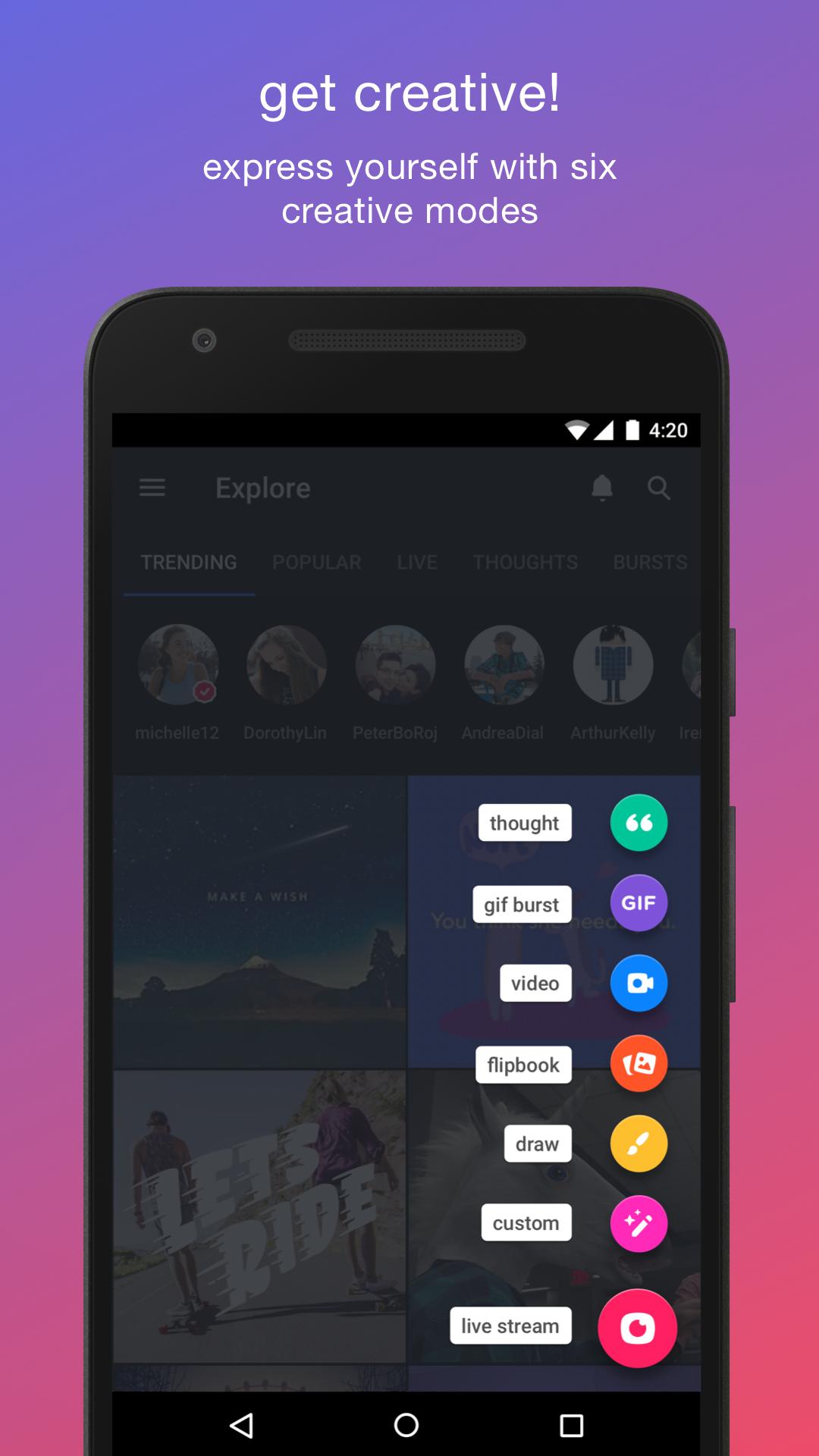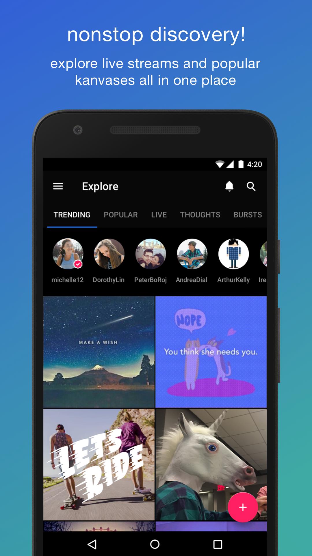 Put your creativity into action with our 6 compose modes by making recording gifs, time-lapse & slow motion videos, animations, drawings and photo slideshows. All kanvases are easily shared to Instagram, Tumblr, Twitter, Facebook, YouTube, Messenger, SMS and email!