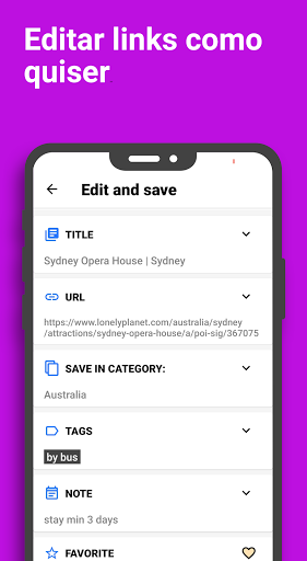 - Todas as ferramentas que você necessita para editar o seu favorito: título, etiqueta, nota, mover