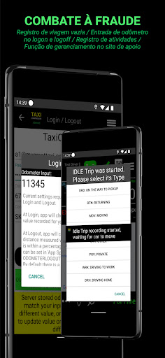 O aplicativo produz relatórios detalhados sobre a atividade do motorista e do carro, como viagens (com passageiro ou ocioso), outras atividades (interrupção de turno, stand-by,...), receitas e despesas e muito mais.