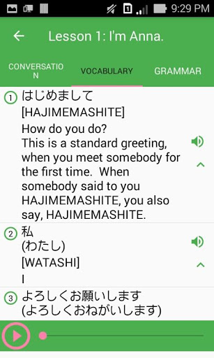 - Aprenda novas palavras japonesas em cada lição.Cada lição tem cerca de 5 - 15 vocabulário com a explicação.Isso irá ajudá-lo a aprender o vocabulário mais fácil.