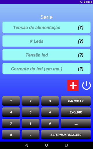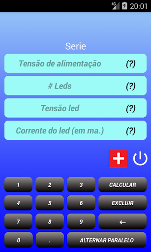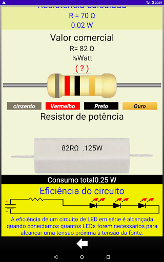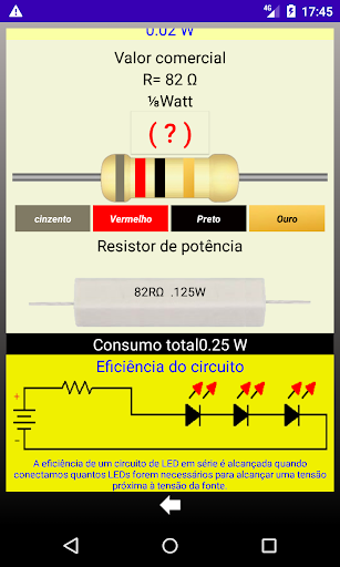 Adicionamos um gráfico de pizza mostrando a eficiência do circuito, a zona vermelha indica o consumo de energia no resistor, a zona verde mostra a energia consumida no led. Calcule realmente a resistência dos seus leds em série ou paralelo, basta inserir nos campos os valores da tensão da fonte, o número de leds, a tensão do led, a corrente do led, toque em calcular e você poderá ver o resultado imediatamente, Se você quiser ver informações adicionais, toque no botão , então você verá os detalhes do circuito, como o gráfico de pizza, a resistência calculada, valor comercial, cores das bandas, potência necessária e consumo total do circuito.