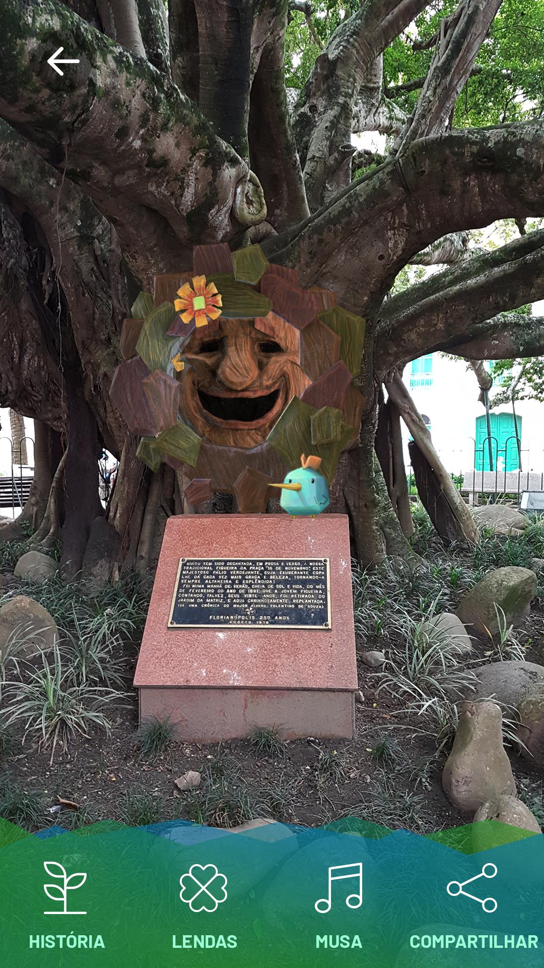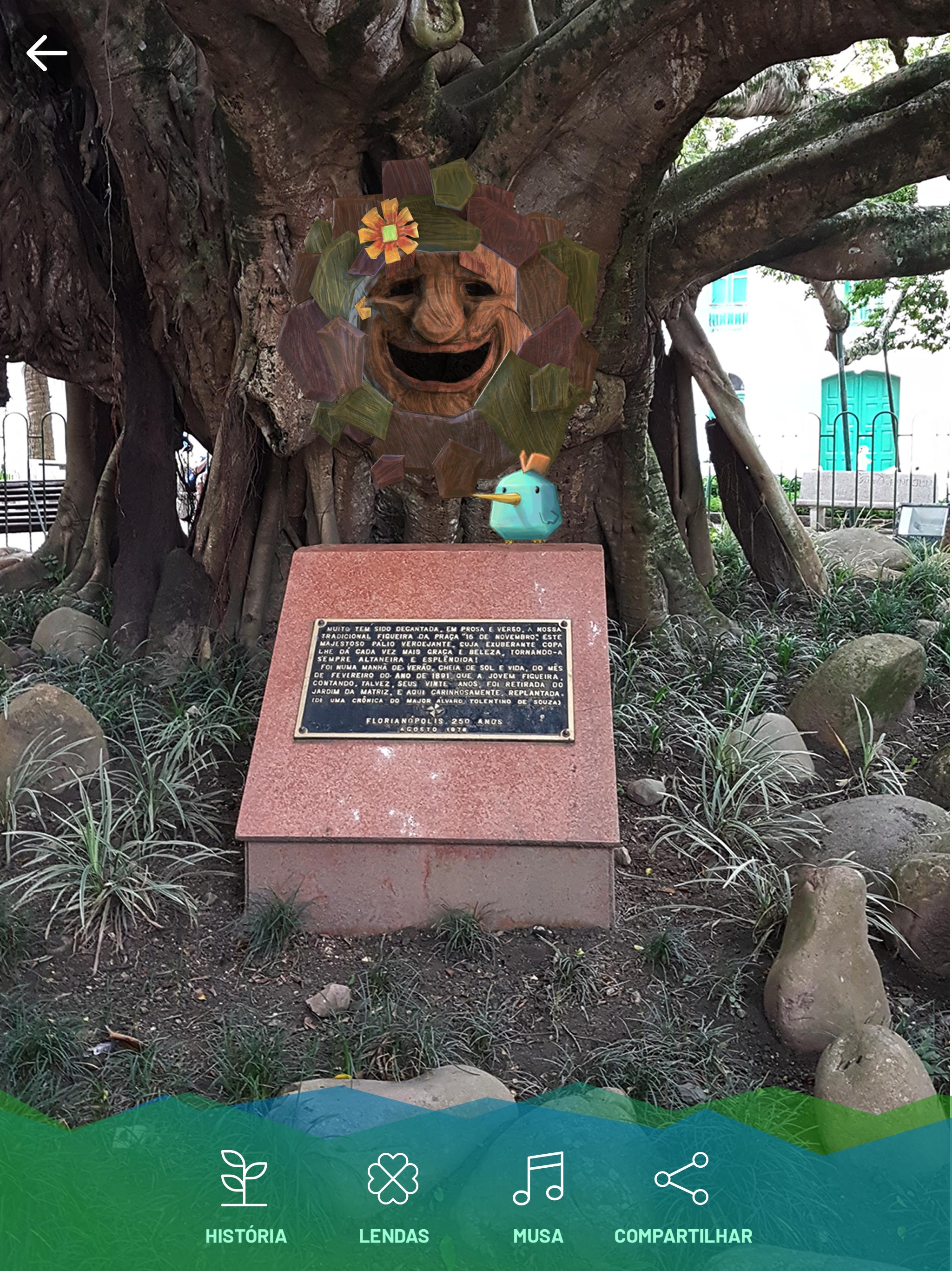 O aplicativo Lendas da Ilha dá vida aos pontos turísticos de Florianópolis, conhecida como ilha da magia, utilizando Realidade Aumentada. O primeiro local é a centenária Figueira da Praça XV, árvore querida por seus habitantes, que contará sua história e lendas a seu respeito.