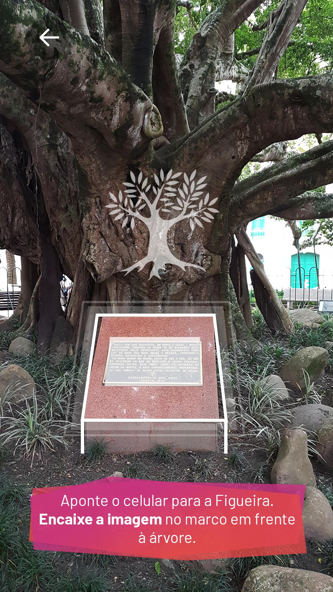 Para ver a Figueira animada, o usuário habilita a câmera do celular, aponta para a árvore e encaixa o marcador no local indicado. A Figueira aparece em Realidade Aumentada e o usuário pode escolher no menu o que quer ver, além de compartilhar os videos parar outros.