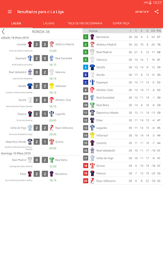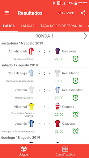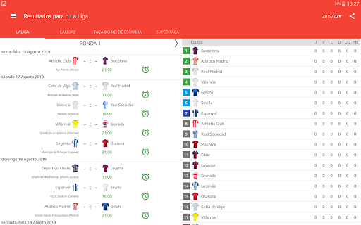Resultados ao Vivo para La Liga 2023/2024 é o aplicativo que lhe permitirá acompanhar os jogos do campeonato de futebol em Espanha, mesmo que você não tenha a possibilidade de assistir TV ou transmissão ao vivo. Ele inclui um calendário, agenda de partidas, classificações e resultados de LaLiga EA Sports, LaLiga Hypermotion, Taça do Rei de Espanha e Super Taça. Com o aplicativo que você não vai perder um gol ou começar de uma partida, porque você vai enviar um push-notificações. Você pode selecionar jogos favoritos e receber notificações só para eles. Em LaLiga temporada 2023/24 jogar as equipas: FC Barcelona, Real Madrid, Sevilla FC, Almeria, Cadiz, Granada, Las Palmas, Rayo Vallecano, Real Sociedad, Mallorca, Girona, Atlético de Madrid, Villarreal CF, Alaves, Osasuna, Getafe CF, real Betis, RC Celta, Valencia CF e Athletic Club.