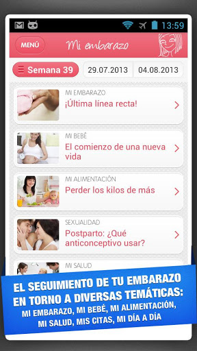 - a evolução da sua gravidez e sua semana de bebê por semana: dicas saudáveis em sua dieta, informações sobre rastrear sua gravidez, os melhores truques para estar em forma e sentir Bom dia a dia.
