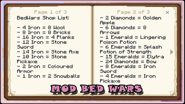 Se você está cansado de correr pelo mundo Minecraft como sempre, deseja diversificar o jogo e jogar com seus amigos, então este mod BedWars é para você. Este é um mini-jogo completo do BedWars que muitos jogadores podem jogar simultaneamente. Existe apenas uma arena chamada Desert Destroyers, onde você lutará, além de uma loja totalmente automatizada. Você poderá coletar itens no jogo e trocá-los por outros itens, e tudo isso é feito com a interface muito simples do baú, e exatamente como é mostrado nas capturas de tela.
