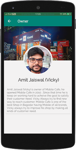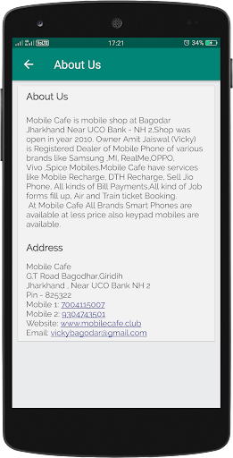 Café é a loja móvel em Bagodar Jharkhand perto da UCO Bank - NH 2, loja foi aberto no ano de 2010. Proprietário Amit Jaiswal (Vicky) é registrado revendedor de celulares de várias marcas como Samsung, Mi, Realme, Oppo, Vivo, Spice Mobiles.Mobile Cafe tem serviços como recarga móvel, recarga dth, vender jio phone, todos os tipos de pagamentos de contas, todos os tipos de formulários de trabalho enchem, ar e trem reserva de bilhetes. N no Café móvel Todas as marcas Smart Phones estão disponíveis a menos preçotambém celulares de teclado estão disponíveis.