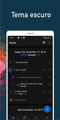 Freqüentemente, uma pessoa tem uma bagunça na cabeça e não sabe por onde começar a tarefa. Ao dividir a tarefa em subtarefas, você elimina a confusão e pode facilmente concluir a tarefa. No aplicativo, a lista de subtarefas pode ser visualizada na forma de uma árvore ou você pode abrir a tarefa e visualizar suas subtarefas.