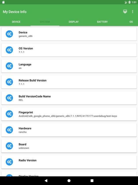 : Device, OS Version, Language, Release Build Version, Build Version Code Name, Fingerprint, Hardware, Board, Radio Version, Display Version, Build Brand, Build Host, Build Time, Build User, SDK Version, Build Serial.