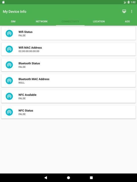 : Wifi Status, Wifi MAC Address, Bluetooth Status, Bluetooth MAC Address, NFC Available, NFC Status.