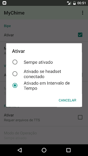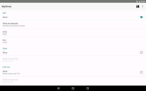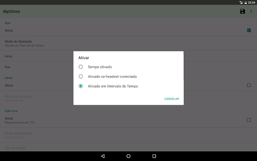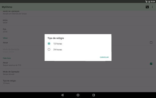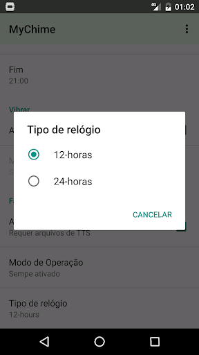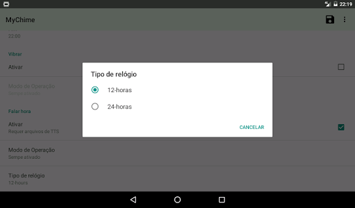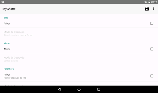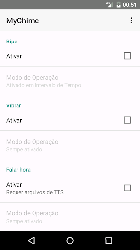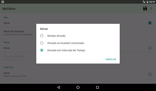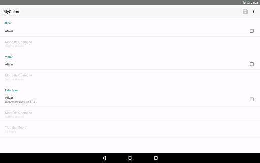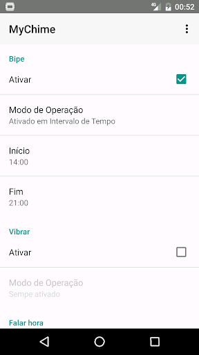 MyChime é um aplicativo que diz a hora e toca um bipe de hora em hora. Pode ser configurado para apenas tocar o bipe (usando o bipe clássico de relógio digital), apenas falar a hora atual (relógio de 12 ou 24 horas) ou ambos. Também pode ser configurado para executar suas ações somente durante um intervalo de horas definido ou para executar-las apenas quando um headset está conectado.