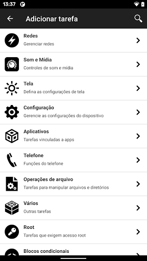 As tarefas que permitem automatizar seu telefone estão na guia "Tarefas" e são categorizadas.