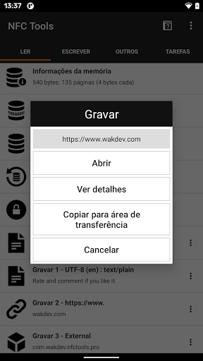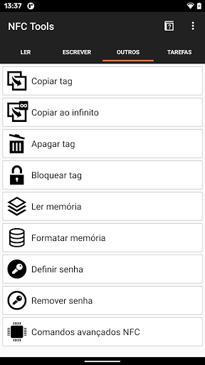 Outros recursos estão disponíveis na guia "Outros", como copiar, apagar e proteger sua tag NFC com uma senha.