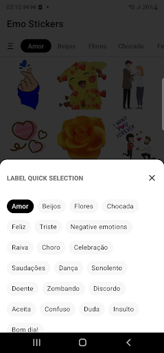 Amor, Beijo, Alegria, Triste, Choro, Chocado, Dançando, Zombaria, Confuso, Dúvida Etc.