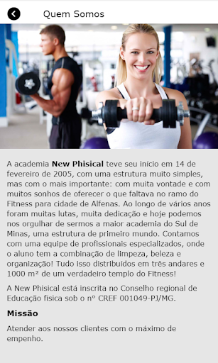 A academia New Phisical teve seu início em 14 de fevereiro de 2005. Conta com uma estrutura simples, porém de primeiro mundo, que oferece o que faltava no ramo do Fitness para cidade de Alfenas - MG.