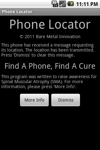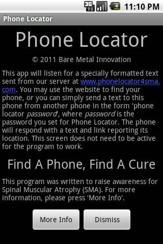 Phone Locator is a quot;find my phonequot; app. Phone Locator will listen for a text from another phone or a specially formatted text sent from our server at www.phonelocator4sma.com. You may use the website to find your phone, or you can simply send a text to this phone from another phone in the form 39;phone locator password39;, where password is the password you set for Phone Locator. You may also use 39;phone locatorsilent password39; if you wish to learn the location of the phone without causing it to beep. The phone will respond by beeping regardless if the phone is in vibrate or silent mode, unless silent was used and by sending a text and link reporting its location. The website can also be used to locate your phone, with a map showing its location. The program does not need to be actively running to work, and does not consume any battery power while waiting for a location request. This app uses text messaging and data services 1 text message to locate the phone from either the website or another phone, and either a text reply or data message to the website, which may incur charges on your phone bill.