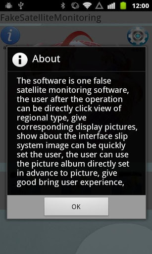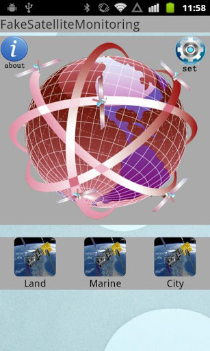 Phone satellite Monitor used for entertainment. Play as a fake app and cheat others in daily life or April Fool's Day!If your mobile phone can play as a Satellite Monitor? Can you know the real-time conditon of land, marine andcity? Now your mobile phone can do these if you have Phone Satellite Monitor on your mobile phone!Phone Satellite Monitor is totally free and more powerful than common monitor! It is (and will be in the future) the most advanced fake monitor on android market! New version support you add pictures form your phone image album and allow you set the picture in advance! It makes this app more realistic! The user after operation can be directly click the view of regional type, give corresponding display pictures, show about the interface slip system image can be quickly set the user!(fake) Deatil FUNCTIONS:1. Play as a phone satellite monitor and can monite all conditions in the world.2. Show you real-time monitoring pictures of land, marine and city.3. Input pictures from your phone pictures in advance!No matter what condition you what to show others, you can shot the picture down and save in your mobile phone, you can show them the picture through this free app!4. About button in upper corner is a help button which can tell you more about this phone monitor!Only the government organization and rich man can get the info getting by satellite monitor? Of corse not! Now your phone has this function too! You can see all bird's-eye view image of city, land and marine!!! And most great thing is it is 100% free! Where can you find a better and more powerful app than it? Only here! Download it now and do not forget offer us five stars to encourage us!NOTE: This powerful app is icon and notifictaion ads supported! And issus or suggestions, can send me email too tell me!More info about Satellite: According to context of spaceflight, a satellite is an object which has been placed into orbit by human endeavour. These objects are sometimes called artificial satellites to distinguish them from natural satellites like the Moon or others.The world's first artificial satellite, named the Sputnik 1, was launched by the Soviet Union in the year of 1957. Since that year, thousands of satellites have been launched into orbit around the Earth. Many satellites, notably space stations have been launched in parts and assembled in orbit. Artificial satellites originate from more than fifty countries and have used the satellite launching capabilities of ten nations. Several hundred satellites are currently operational, whereas thousands of unused satellites and satellite fragments orbit the Earth as space debris. Some space probes have been placed into orbit around other bodies and become artificial satellites to the Moon, Mercury and Venus, Mars and Jupiter, Saturn and the sun