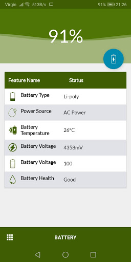 informações sobre bateria (status de conexão, nível, saúde, temperatura e Tensão)
