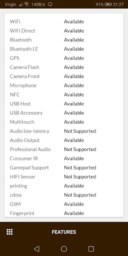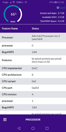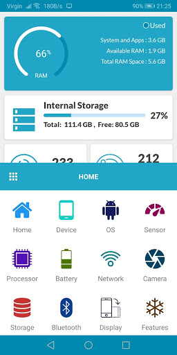 CPU, RAM, sistema operacional, armazenamento, bateria, sim, bluetooth, aplicativos instalados, aplicativos do sistema, exibição, câmera