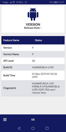 informações do sistema operacional. (Versão, Nível de API, Nível de Patch de Segurança, Tempo de atividade, Build ...)