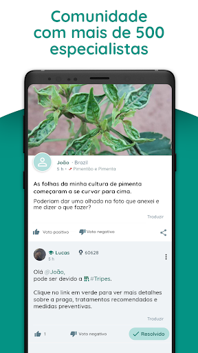 Sempre que você tiver dúvidas sobre agricultura, entre em contato com a comunidade Plantix! Tire proveito do conhecimento de especialistas agrícolas ou ajude outros agricultores com a sua experiência. A comunidade Plantix é a maior rede social de agricultores e especialistas em agricultura do mundo.