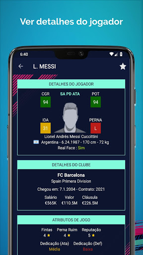 Na tela Detalhes jogador, você é capaz de exibir dados altamente detalhados e Foto do Jogador, Nome Completo, as Posições Preferidas, Data de Nascimento, Altura, Peso, Data de Vencimento do Contrato, Salário, Valor, Escape Clause, Especialidades, Traços, Perna Ruim, Fintas, Dedicação, Classificação dos jogadores por posições.