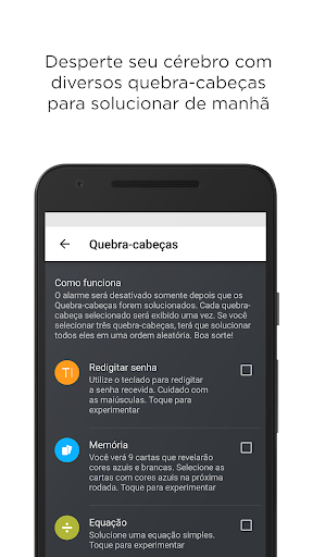 O Alarme Puzzle é o resultado de coçar nossas próprias feridas. Apps comuns de alarme pegavam muito leve conosco de manha, e precisávamos de um app que garantisse que acordaríamos na hora certa. Agora esse app está aqui.