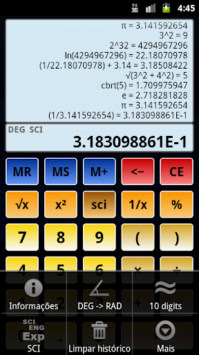 * Cálculos trigonométricos, opcionalmente, em graus (DEG: 1°=PI/180) e radianos (RAD: 1rad=180°/PI).