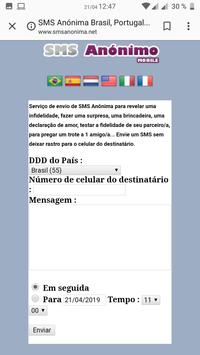 Serviço de envio de SMS Anônima para revelar uma infidelidade, fazer uma surpresa, uma brincadeira, uma declaração de amor, testar a fidelidade de seu parceiro/a, para pregar um trote a 1 amigo/a... Envie um SMS sem deixar rastro para o celular do destinatário.