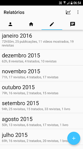 • Visualização de gráficos da evolução do serviço de campo (horas/revisitas/folhetos/livros/estúdios bíblicos)