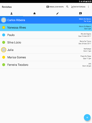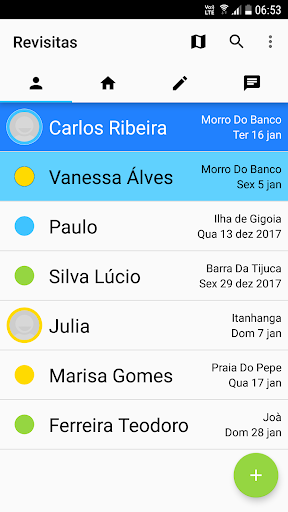 • As revesitas aparecem numa lista com nome/localidade/data da ultima revisita/cor