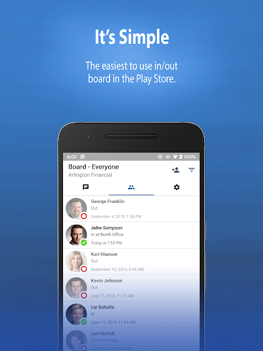 Simples In / Out é o mais fácil de usar em / Out Board na Play Store. É ótimo para escritórios com as pessoas sempre em movimento. Nossa interface fácil de usar permite que você defina rapidamente seu status e volte ao trabalho. Você também pode configurar seu telefone para atualizar seu status automaticamente com base no local do seu dispositivo.